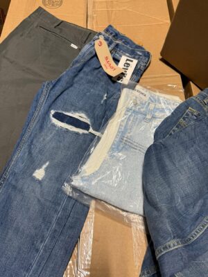 Assorted Denim: 20 pairs of mixed-brand jeans per box, primarily Levi’s.